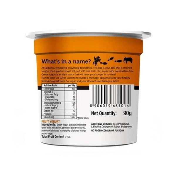 Epigamia is India's first all-natural Greek yogurt. It is thick and creamy in texture, low in fat and high in protein. With 100% real fruits and absolutely no chemical preservatives, enjoy this healthy snack which is available in 8 unique flavours, namely - natural, strawberry, alphonso mango, wild raspberry, blueberry, vanilla bean, green apple and honey banana.