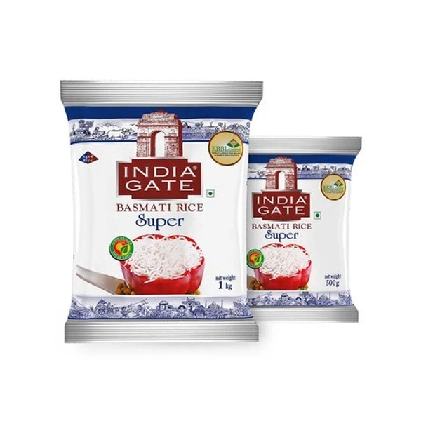 India Gate Super Basmati Rice is optimum quality basmati rice aged to get its superior quality, it is non-sticky when cooked and has gone through an optimum aging process which reduces the moisture content, increases aroma and provides the best cooking and tasting experience, long grain rice, preferred for daily use, ideal for making Briyani, Pulao, etc.