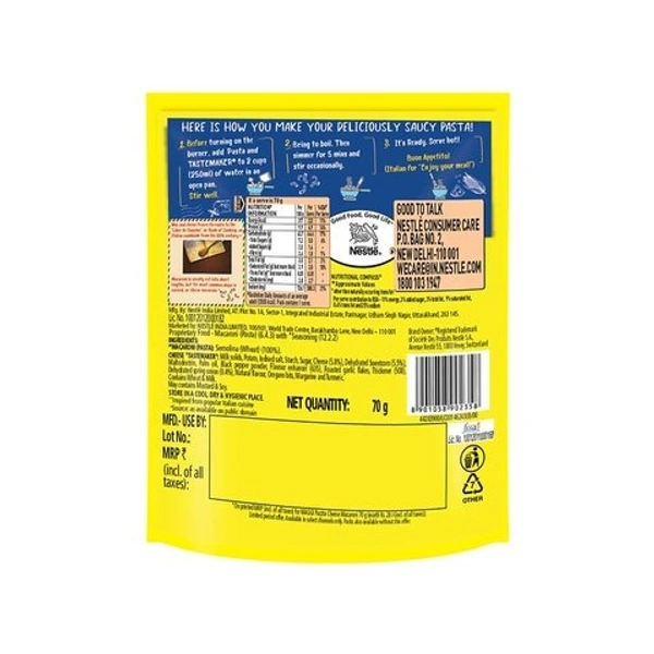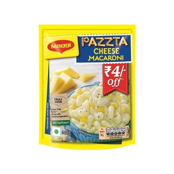 MAGGI Cheese Macaroni Pazzta is delicious, quick and easy. The pasta is made with 100% suji/ rawa (semolina) and is ready in just 5 minutes! It makes a great snacking option or sides for your everyday meals. Toss in some bell peppers or olives to make your pasta meal more wholesome and delicious! Serving Instructions: 1 serve=70g; Toss in some olives and bell pepper for more wow. Serve hot.