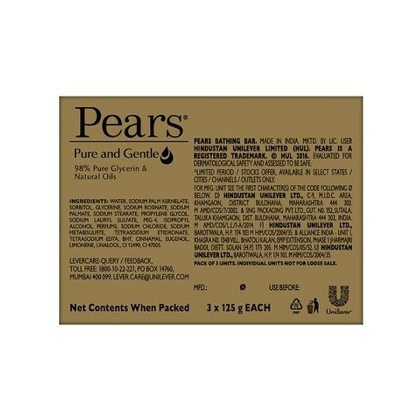 There's nothing like knowing that your skin is soft, smooth and glowing. With the right products you can have that feeling every single day, starting with your cleansing routine. Pears understands this and brings to you its heritage product - the glycerine soap, Pears Pure & Gentle Bathing Bar. With 100% more glycerine vs grade 1 soap, Pears Pure & Gentle mild bathing bar, cleanses your skin for visibly glowing, brighter skin, every time you shower. This bathing bar soap with glycerine helps preserve the moisture of your skin and keeps it soft and glowing. Pears' gentle formula has 0% Parabens and is mild on skin. Pears Bathing Bar Soap also helps wash away germs. Just rub it between your hands and massage rich creamy lather over your face and body before rinsing away thoroughly. For best results, use twice a day, morning and evening. Pears Pure & Gentle Bathing Bar is packed in 100% recyclable cartons, our initiative towards being environmental friendly. Explore the entire range of Pears Pure & Gentle Body Wash & Liquid Hand Wash that are 100% soap Free, pH balanced and dermatologically tested. Add the Pears Range to your beauty regime to see for yourself.